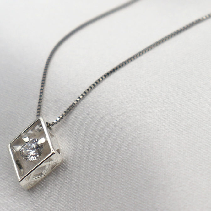 0.2ctのダイヤモンドがセッティングされた菱形のネックレスが、上品さを与えてくれます。